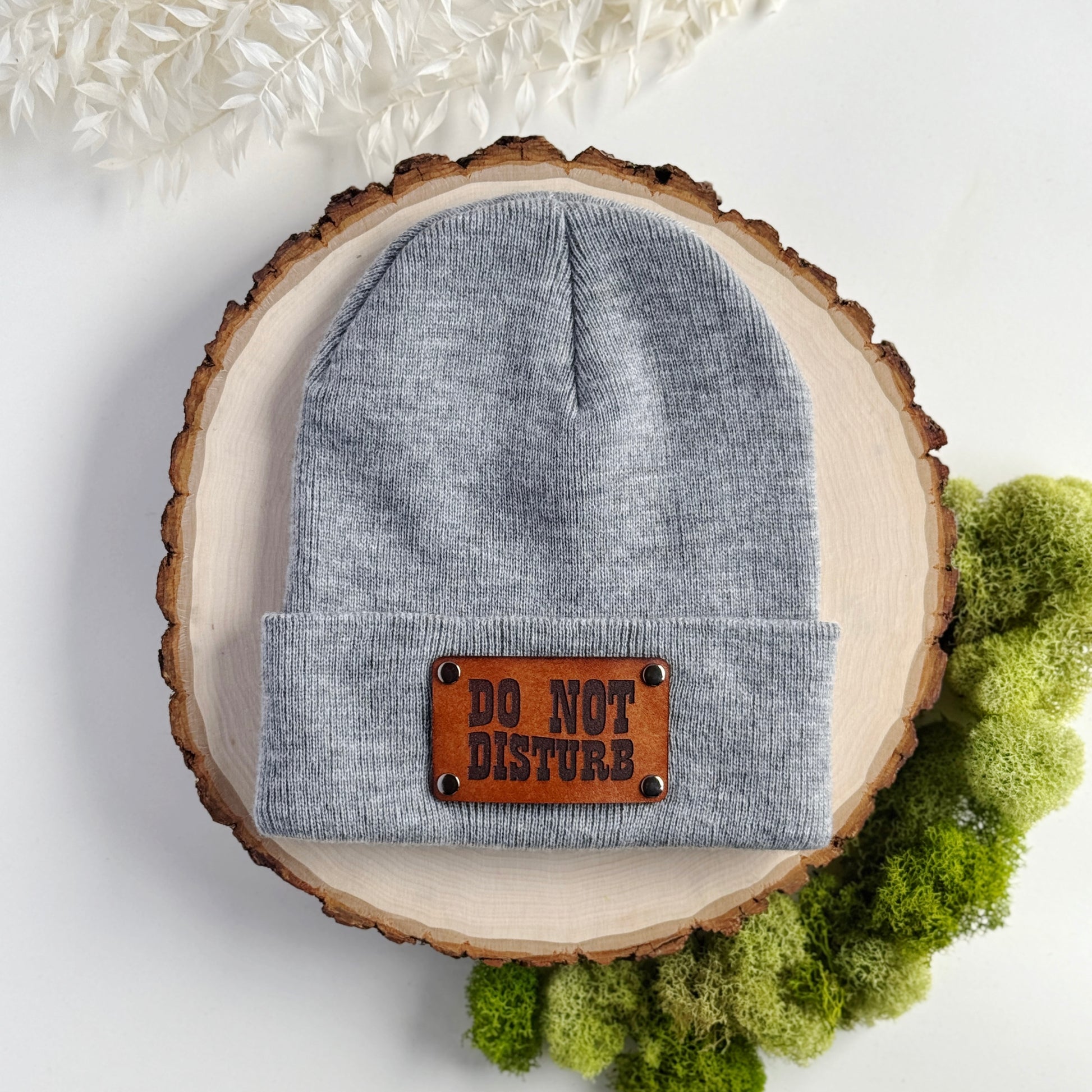 Do Not Disturb beanie with snap on/off leather patch