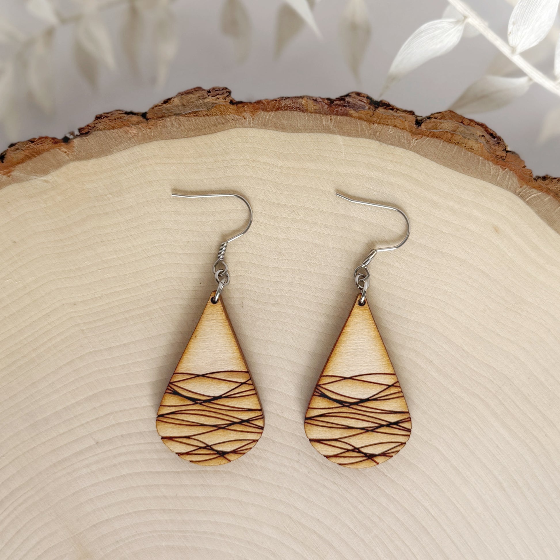 Each wood earring is precision laser cut, gently sanded, and delicately coated with a protective sealant for stylish durability. Stainless steel hooks and rings are both hypoallergenic and long-lasting, ensuring comfortable all-day wear.